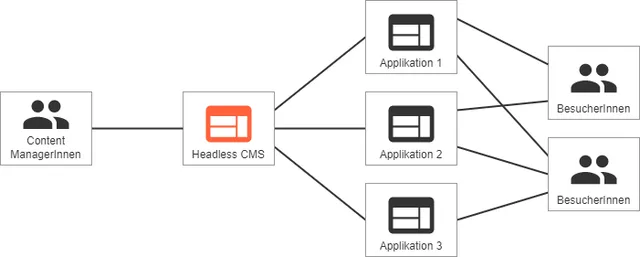 Ganz im Gegensatz dazu steht die Grundidee hinter einem Headless CMS. Es gibt nicht die eine Stelle (also bspw. die Webseite), für die Inhalte erstellt werden. Theoretisch können Teile der gepflegten Inhalte auf einer Webseite erscheinen, vielleicht aber auch nicht. Möglicherweise werden Teile der Inhalte zusätzlich in E-Mails benötigt, vielleicht aber auch nicht. Oder der Inhalt erscheint auf Werbebannern, in Apps, in Feeds, auf gedruckten Flyern oder er erscheint überhaupt nirgendwo. Die Entscheidung, wo der Inhalt auftaucht, obliegt nicht mehr der Content Managerin im Headless CMS, sondern den Verantwortlichen für die konsumierenden Applikationen und das können letztlich sehr viele sein.